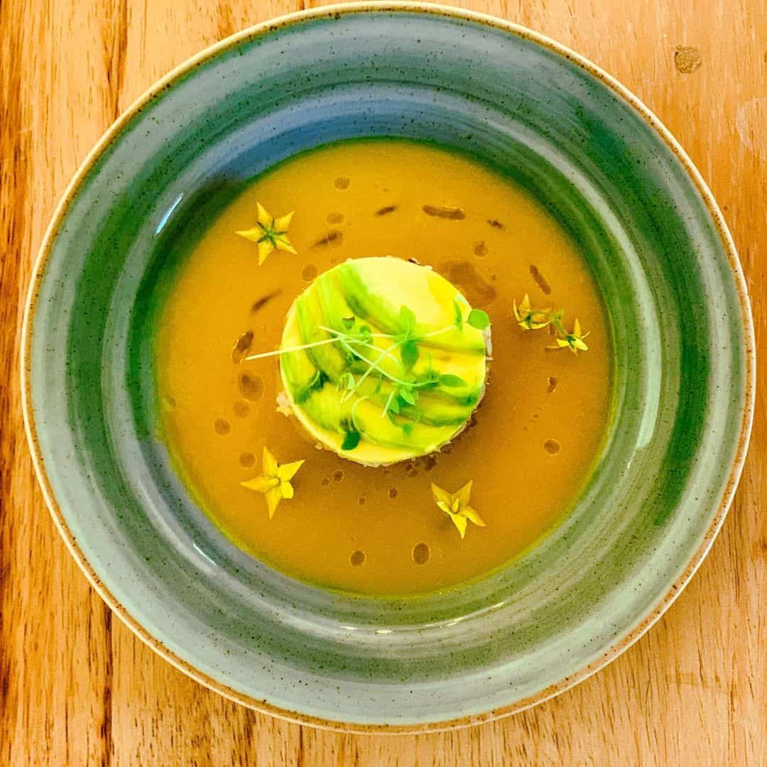 Gaspacho de pêssego e salada de caranguejo